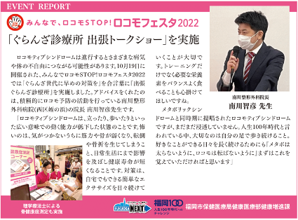 『ロコモフェスタ2022 in 新天町』にて、南川智彦院長とのトークショーに参加された瀬戸さんが編集長を務める、フリーマガジン「ぐらんざ」にてイベントの様子が紹介されています。福岡市健康づくりチャンネルや特設サイトでも「ロコモの基礎知識と予防方法」に関する話が紹介されています。ぜひ御覧ください!