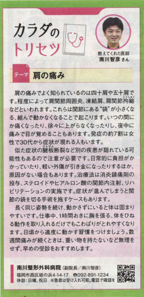 20~40代女性に多い肩の病気に関する先生からのメッセージが掲載されております。福岡都市圏エリアで約35万部が配布されておりますので、お手元に届いた際はぜひご覧ください(^^)。