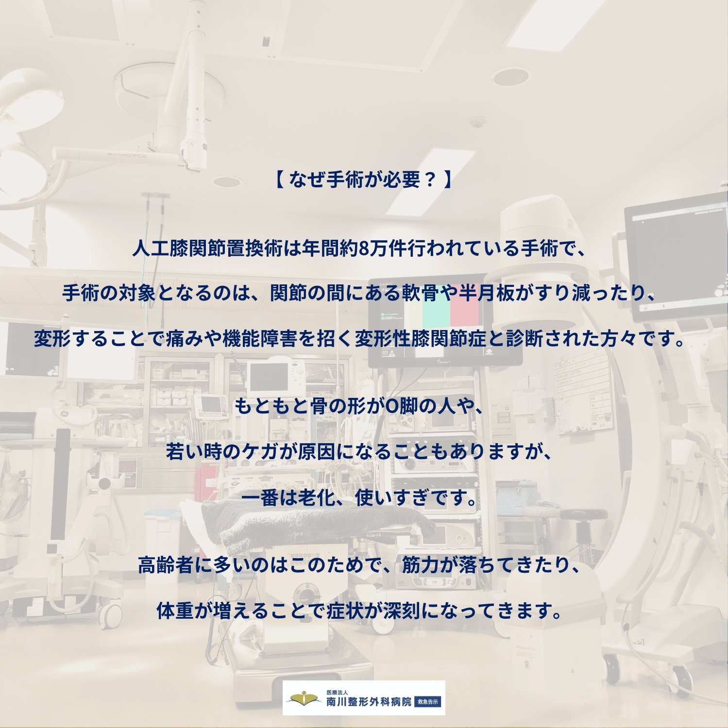 ■なぜ手術が必要? 人工膝関節置換術は年間約8万件行われている手術で、手術の対象となるのは、関節の間にある軟骨や半月板がすり減ったり、変形することで痛みや機能障害を招く変形性膝関節症と診断された方々です。もともと骨の形がO脚の人や、若い時のケガが原因になることもありますが、一番は老化、使いすぎです。高齢者に多いのはこのためで、筋力が落ちてきたり、体重が増えることで症状が深刻になってきます。
