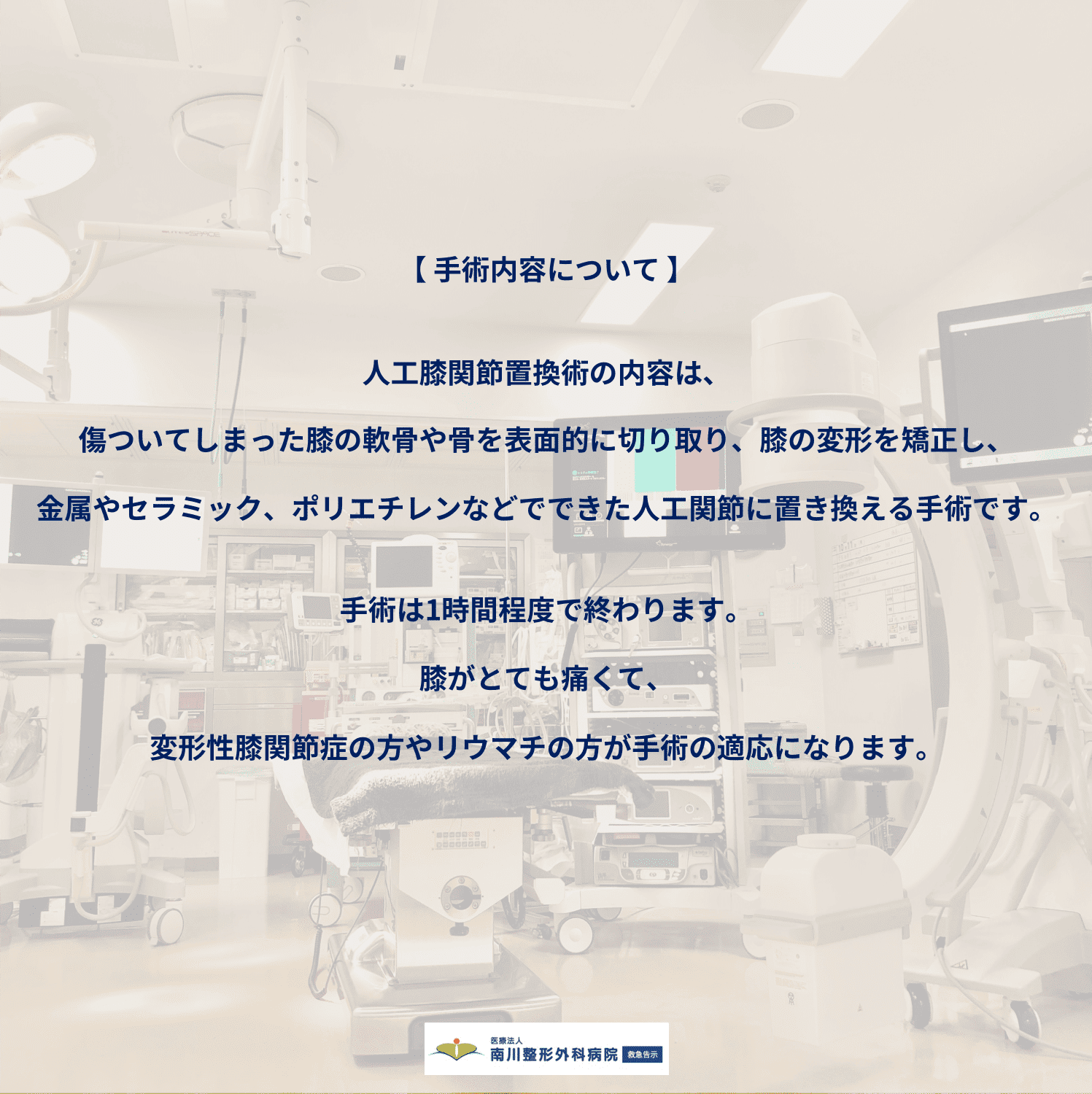 ■手術内容について 人工膝関節置換術の内容は、傷ついてしまった膝の軟骨や骨を表面的に切り取り、膝の変形を矯正し、金属やセラミック、ポリエチレンなどでできた人工関節に置き換える手術です。手術は1時間程度で終わります。膝がとても痛くて、変形性膝関節症の方やリウマチの方が手術の適応になります。
