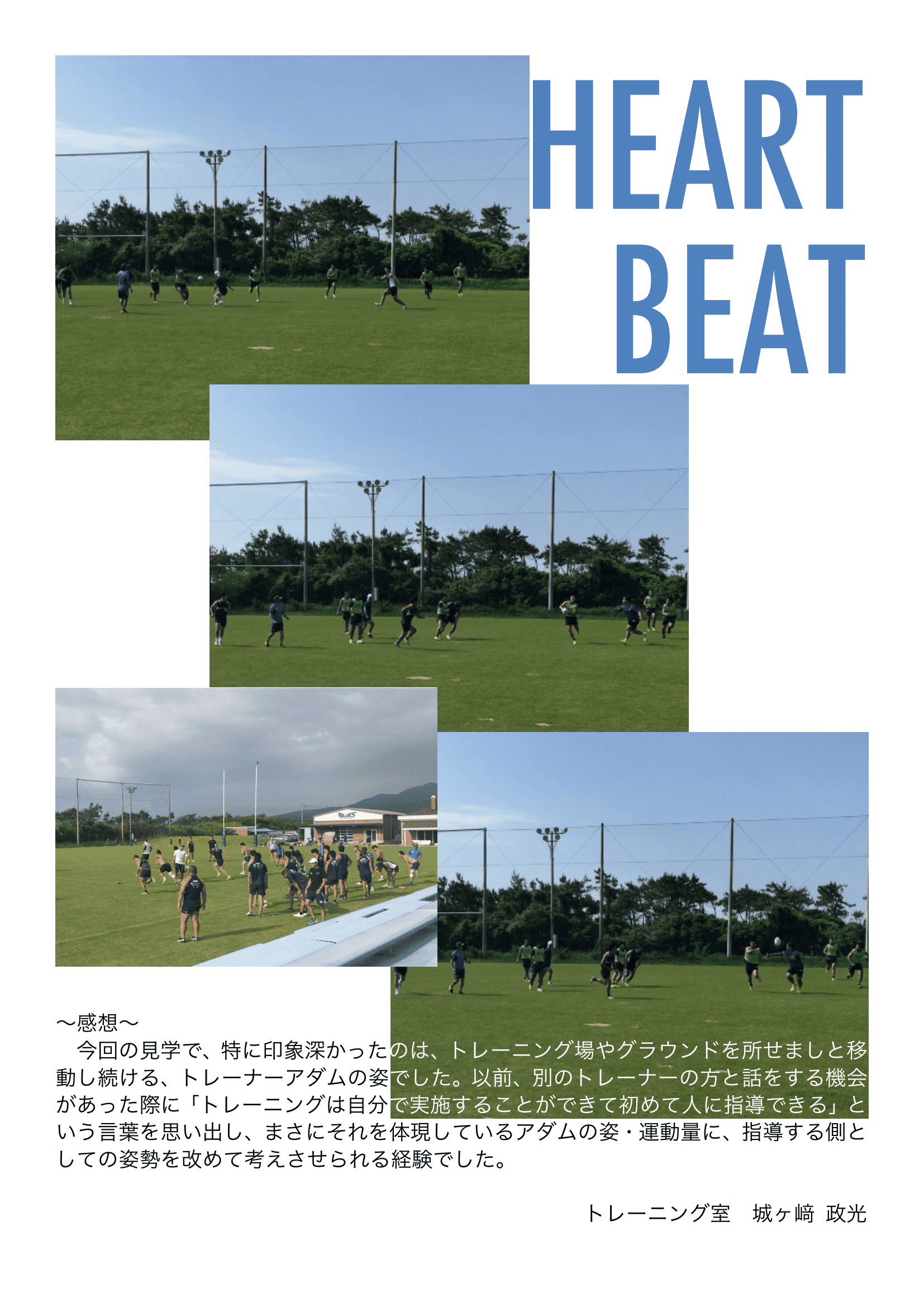今回の見学で、特に印象深かったのは、トレーニング場やグラウンドを所せましと移動し続ける、トレーナーアダムの姿でした。以前、別のトレーナーの方と話をする機会があった際に「トレーニングは自分で実施することができて初めて人に指導できる」という言葉を思い出し、まさにそれを体現しているアダムの姿・運動量に、指導する側としての姿勢を改めて考えさせられる経験でした。