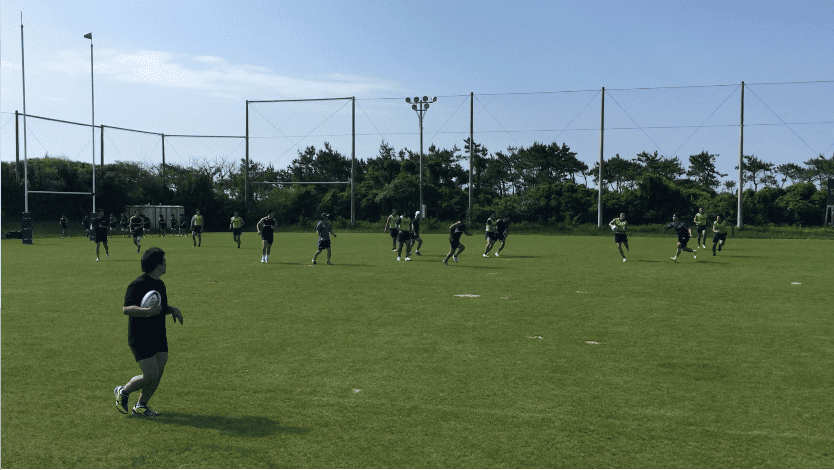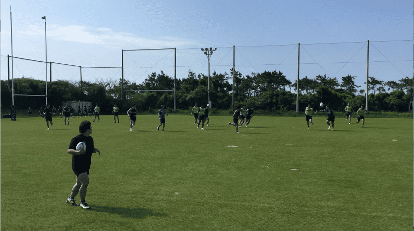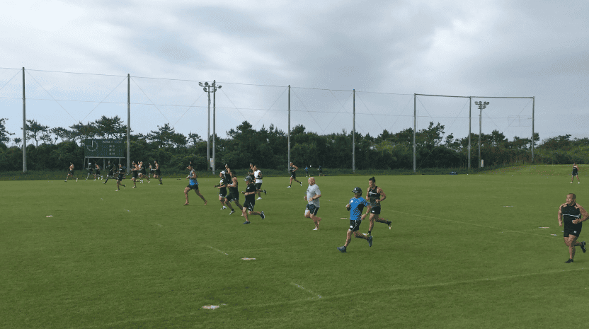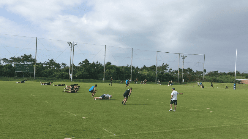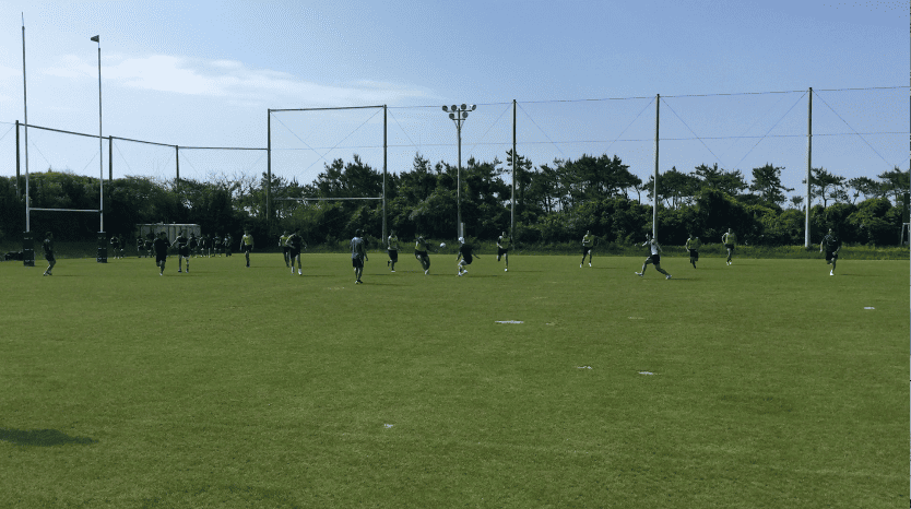 午前練習は、トレーニング室で軽負荷を加えたワークアウトをテンポよくスタート、その後、屋外のラグビー専用グラウンドへ移動。ストレングス&コンディショニングコーチであるアダム主導のもと、ランジやスクワット、ベアウォークなど全身を使うアップなど、バリエーション豊富なメニューを進めていった。アップメニューの後半では、ランを中心に細かく強度を設定しダッシュを行い、かつダイナミックストレッチも織り交ぜながらチーム全体でリズムよく練習は進んだ。その後、水分補給を十分に行い、フォワード(FW)/バックス(BK)に分かれ専門のトレーニングへと移行していった。FWは1on1や3on3でのスクラム練習やパスワーク、BKはゲーム形式のタッチフットを中心にフィットネスの負荷を上げながら「走る」ことを中心にトレーニングメニューを組んでいるようであった。そんな中にも、ボクササイズメニューを織りまぜるなど飽きのこないトレーニングメニューが組まれていた。トレーナーの運動量も豊富で、自ら動きながら、走りながら指導を行うアダムの姿が印象的であった。その後、FW/BK合同の練習を、試合中の様々なシュチュエーションを想定しながら「ラインアウト」「スクラム」「アンストラクチャー」それぞれの仕事をそれぞれが遂行していった。特に印象に残ったのは、選手間同士の声出しや、練習中のコミュニケーションを大切にしている姿で、その都度熱心に話し合いを行なっている光景が印象的であった。