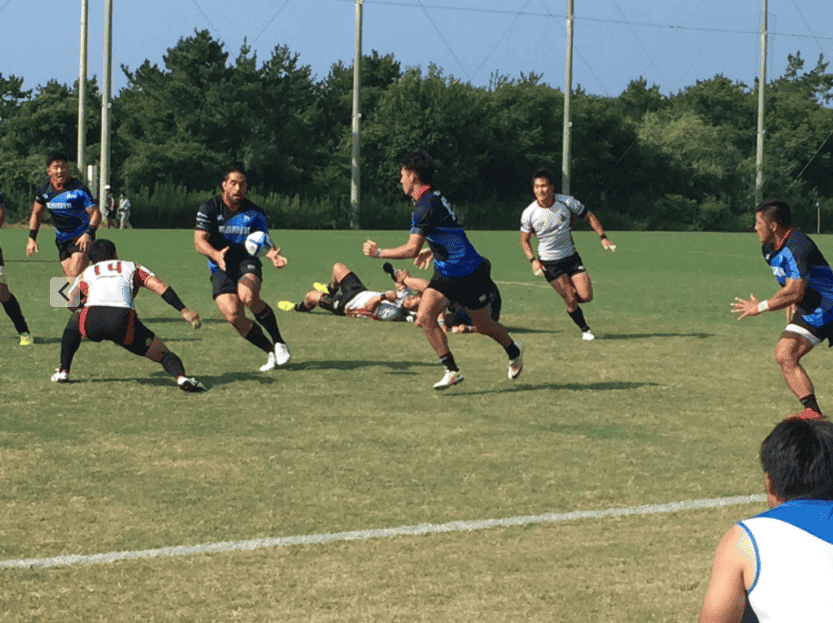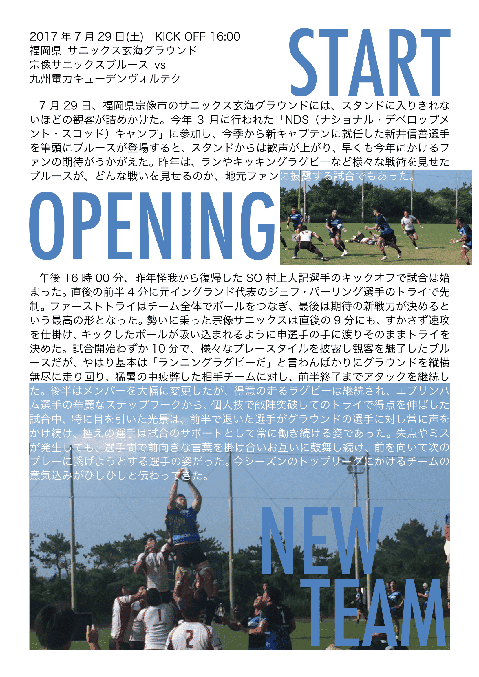 午後16時00分、昨年怪我から復帰したSO村上大記選手のキックオフで試合は始まった。直後の前半4分に元イングランド代表のジェフ・パーリング選手のトライで先制。ファーストトライはチーム全体でボールをつなぎ、最後は期待の新戦力が決めるという最高の形となった。勢いに乗った宗像サニックスは直後の9分にも、すかさず速攻を仕掛け、キックしたボールが吸い込まれるように申選手の手に渡りそのままトライを決めた。試合開始わずか10分で、様々なプレースタイルを披露し観客を魅了したブルースだが、やはり基本は「ランニングラグビーだ」と言わんばかりにグラウンドを縦横無尽に走り回り、猛暑の中疲弊した相手チームに対し、前半終了までアタックを継続した。後半はメンバーを大幅に変更したが、得意の走るラグビーは継続され、エブリンハム選手の華麗なステップワークから、個人技で敵陣突破してのトライで得点を伸ばした。試合中、特に目を引いた光景は、前半で退いた選手がグラウンドの選手に対し常に声をかけ続け、控えの選手は試合のサポートとして常に働き続ける姿であった。失点やミスが発生しても、選手間で前向きな言葉を掛け合いお互いに鼓舞し続け、前を向いて次のプレーに繋げようとする選手の姿だった。今シーズンのトップリーグにかけるチームの意気込みがひしひしと伝わってきた。