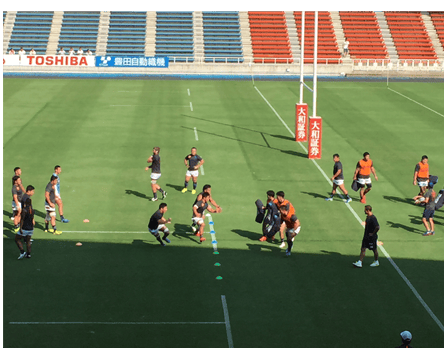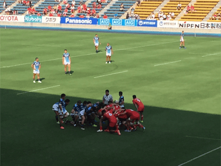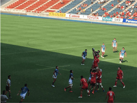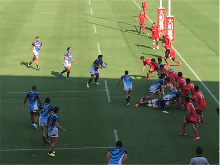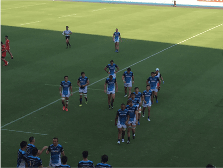 試合開始直後から、コカコーラにプレッシャーをかけ、相手のペナルティーからラインアウトを獲得。一気に敵陣に攻め込むとモールを押し込み、HO星本泰憲選手がインゴールに飛び込み、ブルースは今季の初得点をあげた。その後、スクラムでも相手をプッシュしペナルティーキックを獲得。早速、今季注目の”セットピース”からの攻撃を見せる場面が訪れた中でも、落ち着いて自分たちの強さを見せつけ、ブルースは序盤から相手を圧倒していった。前半、立て続けに相手エリアで有利に立ち、連続で得点していくチームの姿に、新シーズンに向ける”勢い”と新戦力との”融合”を遂げた「新生ブルース」の姿を見ることができた。開幕戦独特の緊張感が残る中、試合中盤にかけてペナルティーを犯した方に流れが傾く状況の中でも、スクラムで流れを引き戻し、後半には2015W杯でも活躍したカーンヘ・スケス選手の驚異的なトライで点差を広げ、38-22で開幕戦の勝利を飾った。