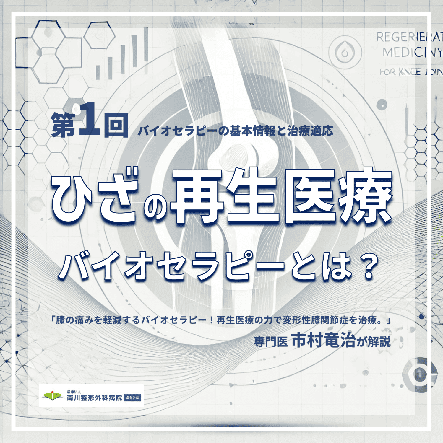 「膝の再生医療」について、整形外科部長の市村竜治医師が患者様からのご質問にお答えするシリーズをお届けします。第1回は「バイオセラピーの基本情報と治療適応」についてです。