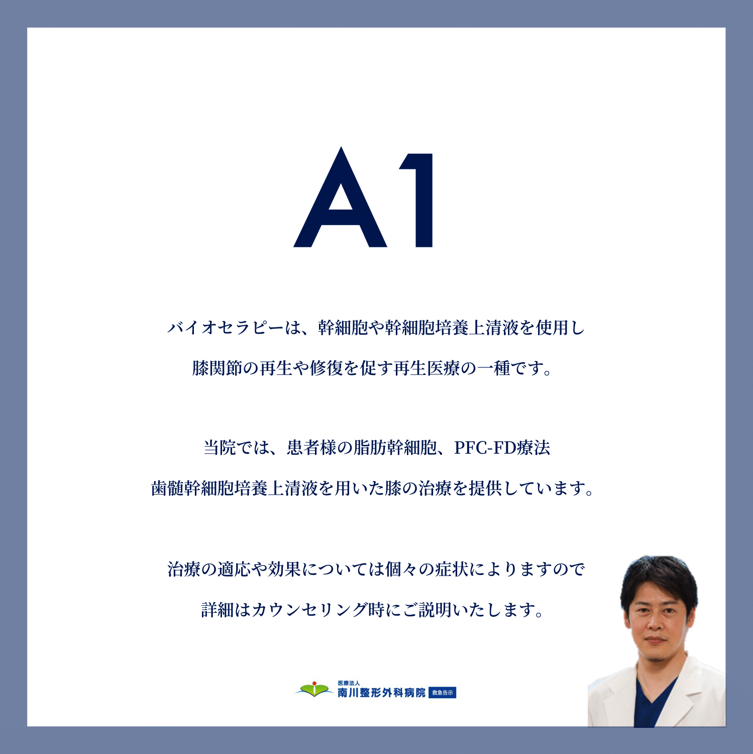 A1:「バイオセラピーは、幹細胞や幹細胞培養上清液を使用し、膝関節の再生や修復を促す再生医療の一種です。当院では、患者様の脂肪幹細胞、PFC-FD療法、歯髄幹細胞培養上清液を用いた膝の治療を提供しています。治療の適応や効果については個々の症状によりますので、詳細はカウンセリング時にご説明いたします。
