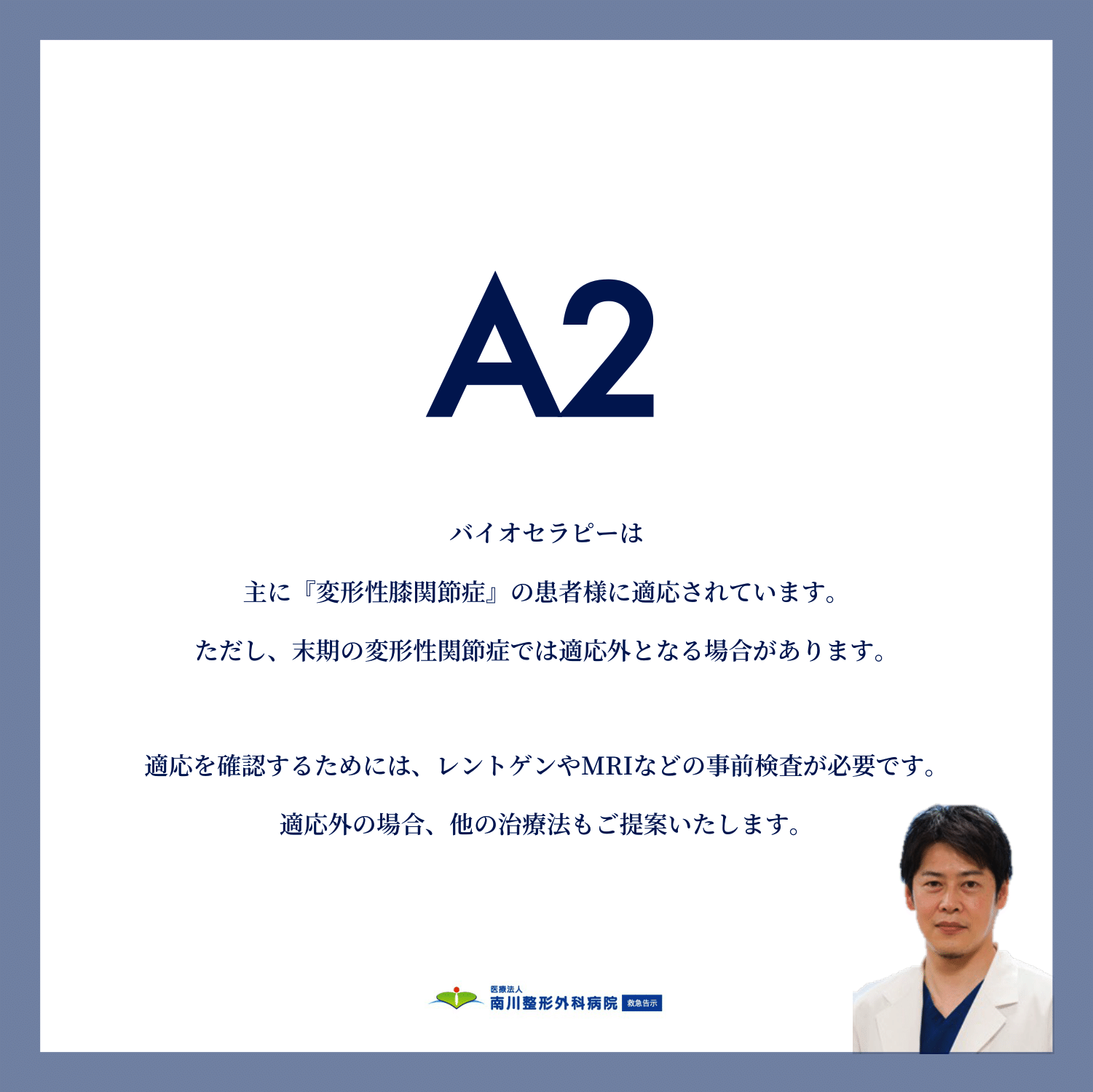 A2:「バイオセラピーは、主に『変形性膝関節症』の患者様に適応されています。ただし、末期の変形性関節症では適応外となる場合があります。適応を確認するためには、レントゲンやMRIなどの事前検査が必要です。適応外の場合、他の治療法もご提案いたします。」