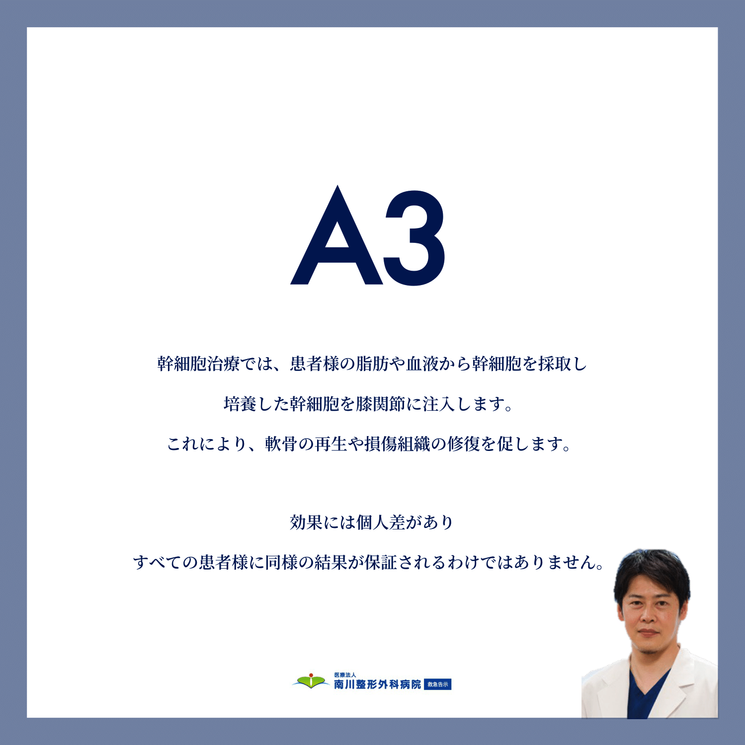 A3:「幹細胞治療では、患者様の脂肪や血液から幹細胞を採取し、培養した幹細胞を膝関節に注入します。これにより、軟骨の再生や損傷組織の修復を促します。効果には個人差があり、すべての患者様に同様の結果が保証されるわけではありません。」