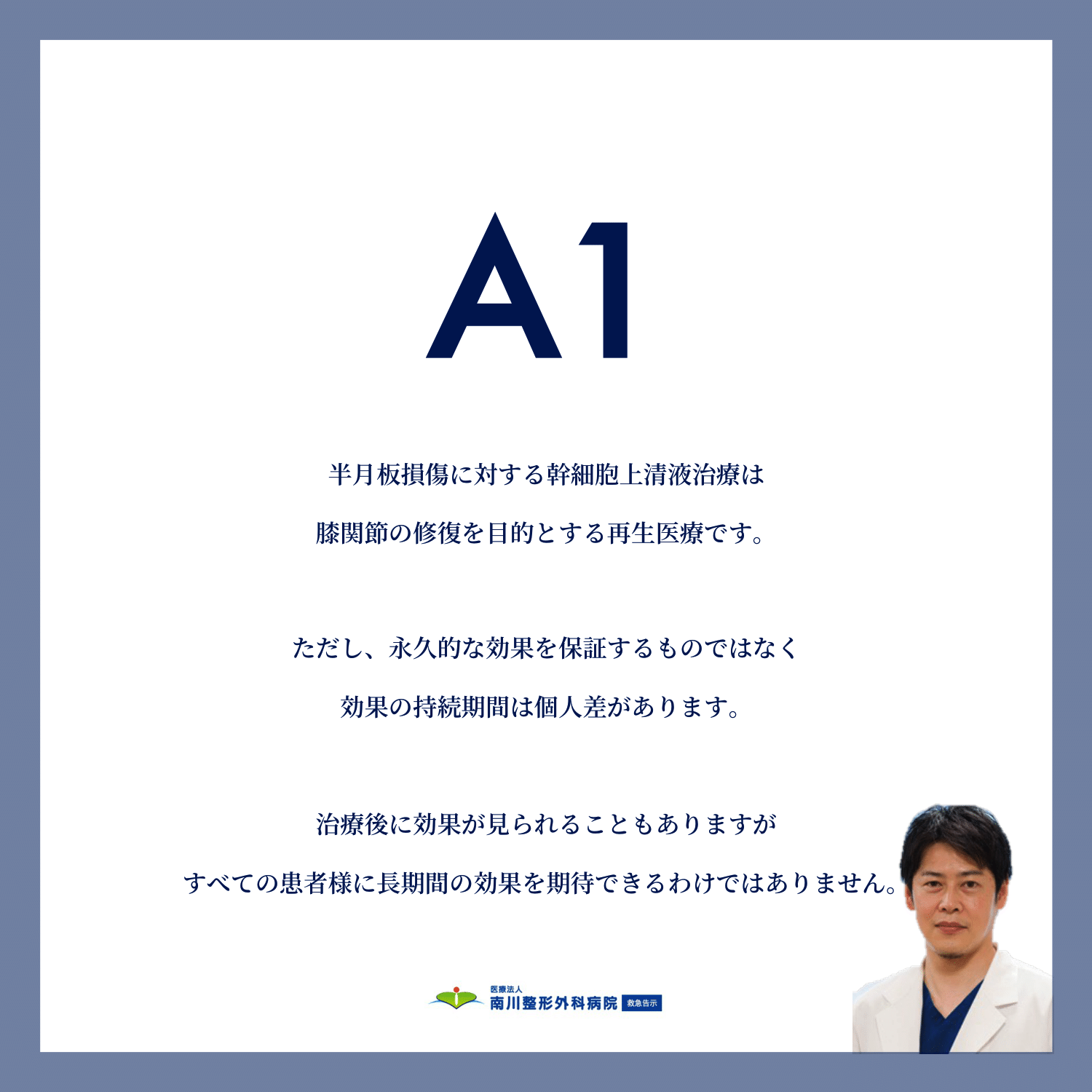 A1:半月板損傷に対する幹細胞上清液治療は、膝関節の修復を目的とする再生医療です。ただし、永久的な効果を保証するものではなく、効果の持続期間は個人差があります。治療後に効果が見られることもありますが、すべての患者様に長期間の効果を期待できるわけではありません。