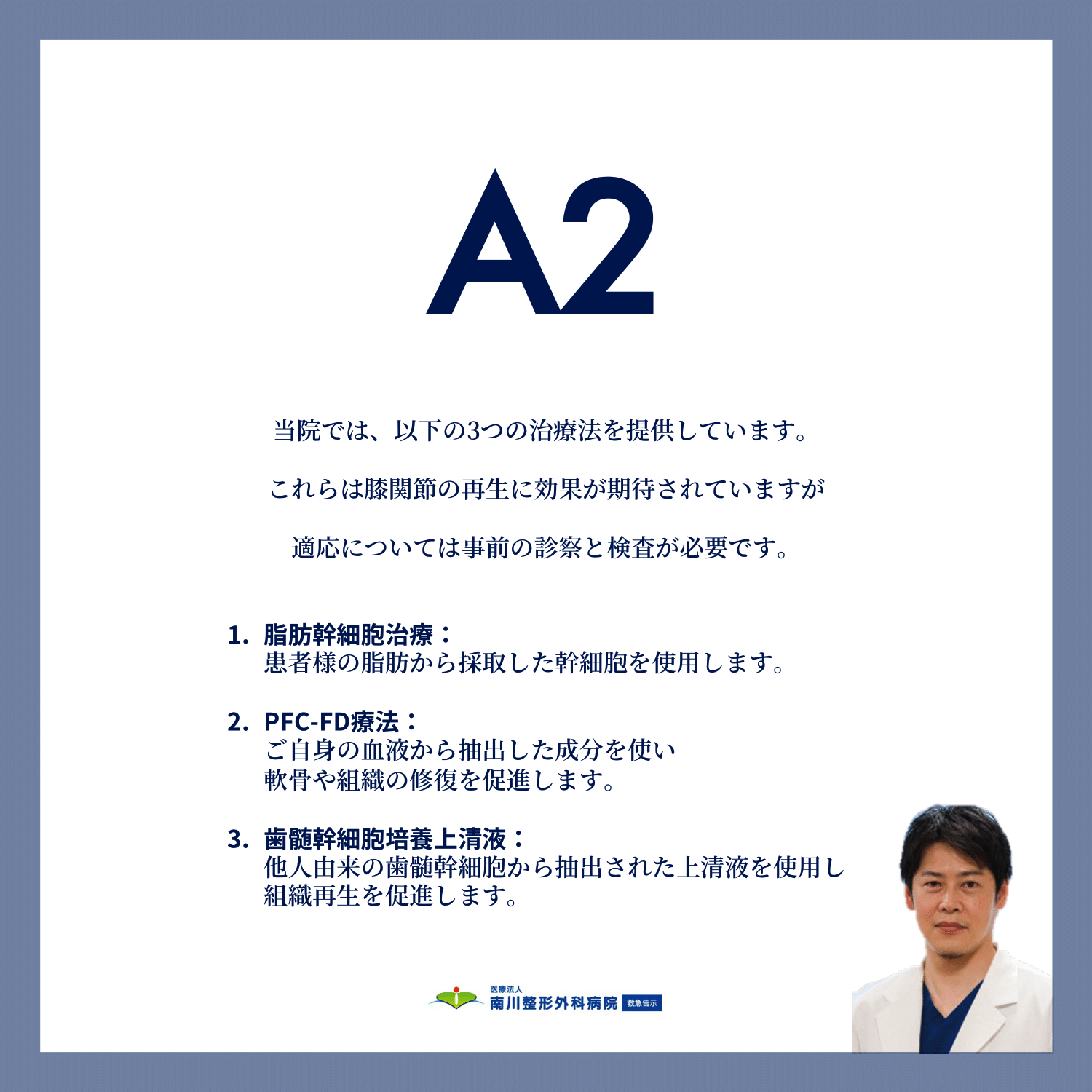 A2:当院では、以下の3つの治療法を提供しています。これらは膝関節の再生に効果が期待されていますが、適応については事前の診察と検査が必要です。