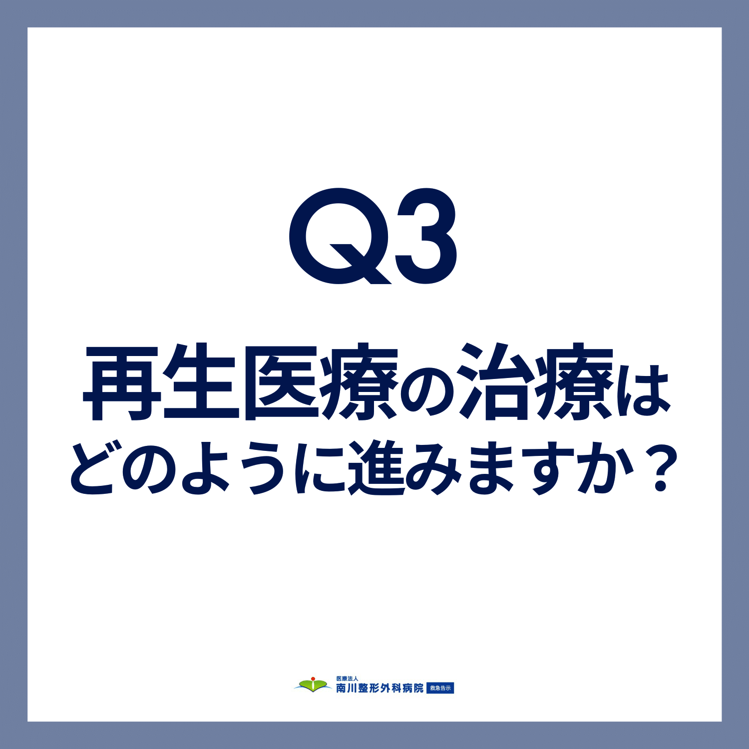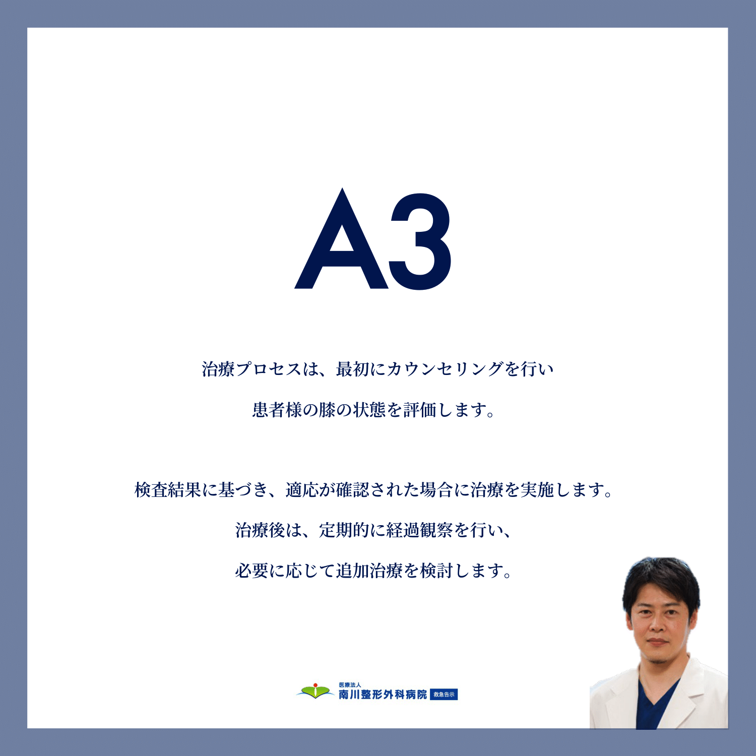 A3:治療は、最初にカウンセリングを行い、患者様の膝の状態を評価します。検査結果に基づき、適応が確認された場合に治療を実施します。治療後は、定期的に経過観察を行い、必要に応じて追加治療を検討します。