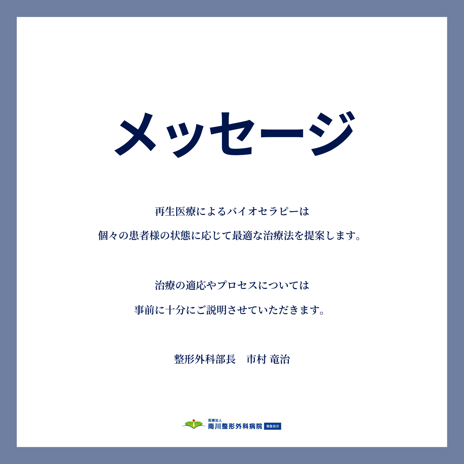 「再生医療によるバイオセラピーは、個々の患者様の状態に応じて最適な治療法を提案します。治療の適応やプロセスについては、事前に十分にご説明させていただきます。」