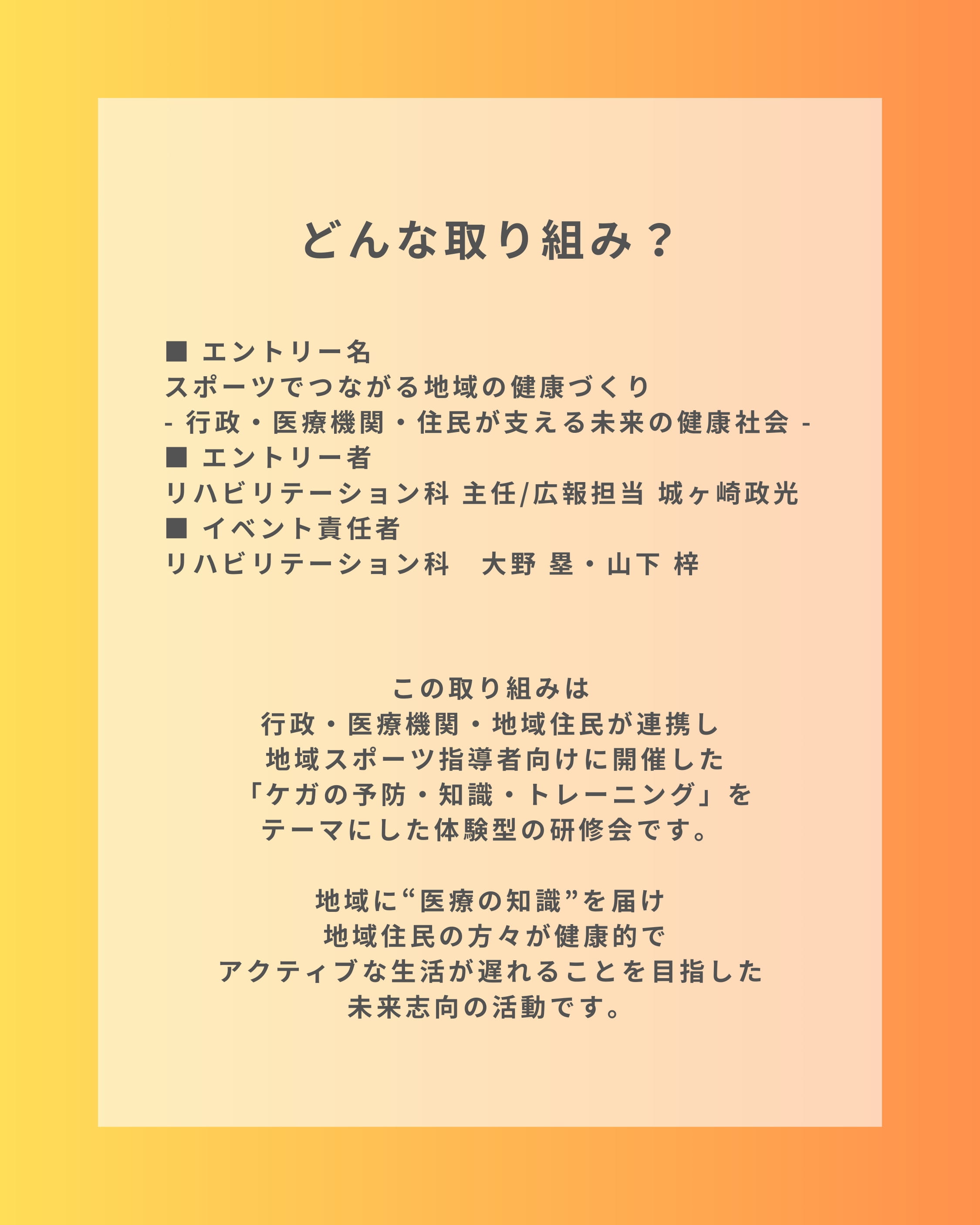 地域に“医療の知識”を届け、地域住民の方々が健康的でアクティブな生活が遅れることを目指した、未来志向の活動です!