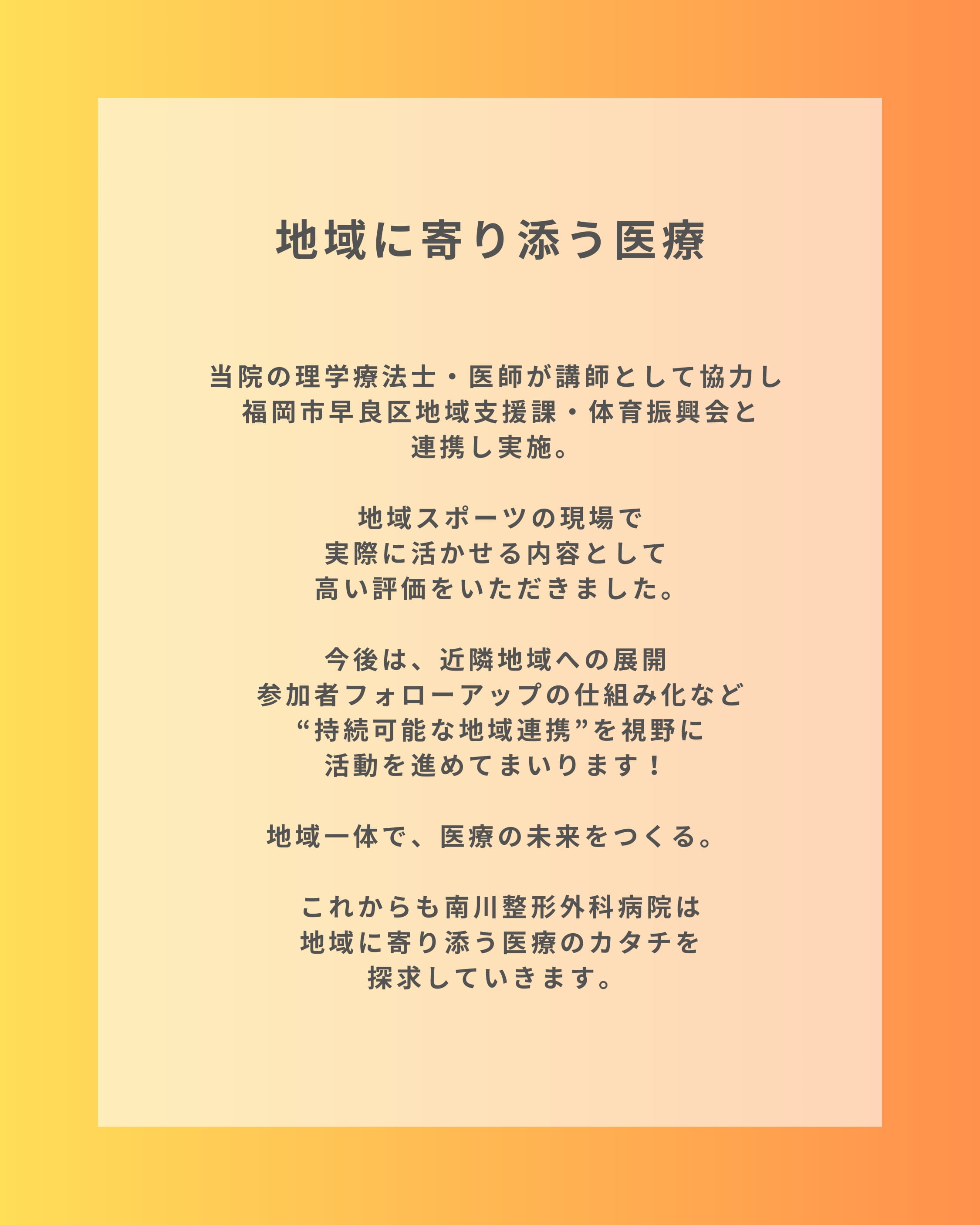 これからも南川整形外科病院は地域に寄り添う医療のカタチを探求していきます!