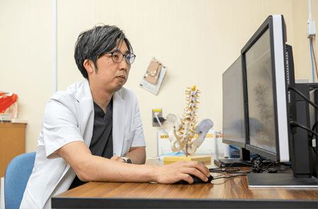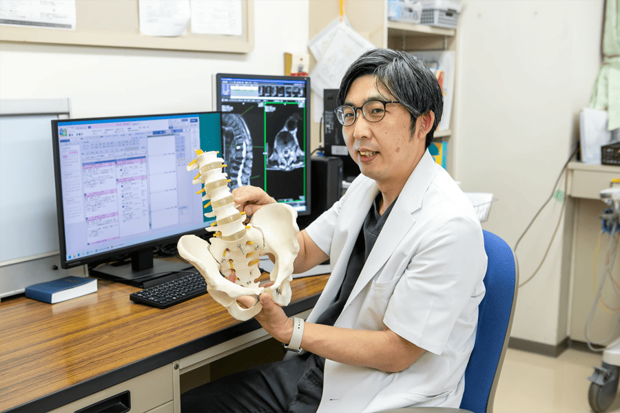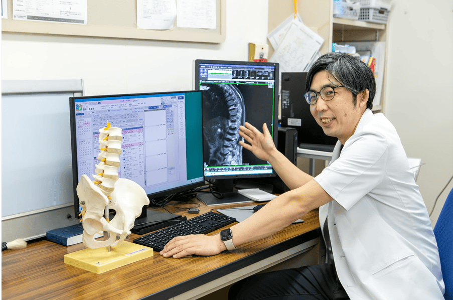 「背骨は、からだの中心を支える大切な柱です。私は“せぼね”の疾患を専門としており、手足のしびれや首・腰の痛みに関する診療を行っています。画像だけに頼らず、お話をじっくり伺い、身体所見を丁寧に積み重ねることを大切にしています。手術が必要な場合でも、患者さんにとって最も負担の少ない方法を一緒に考えていきます。」