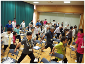 ロコモティブシンドロームのセルフチェック及び立ち上がりテストによるロコモ度判定、当院の市村先生による講義、リハビリスタッフによるロコモ体操の実践等、盛り沢山な内容となりました。