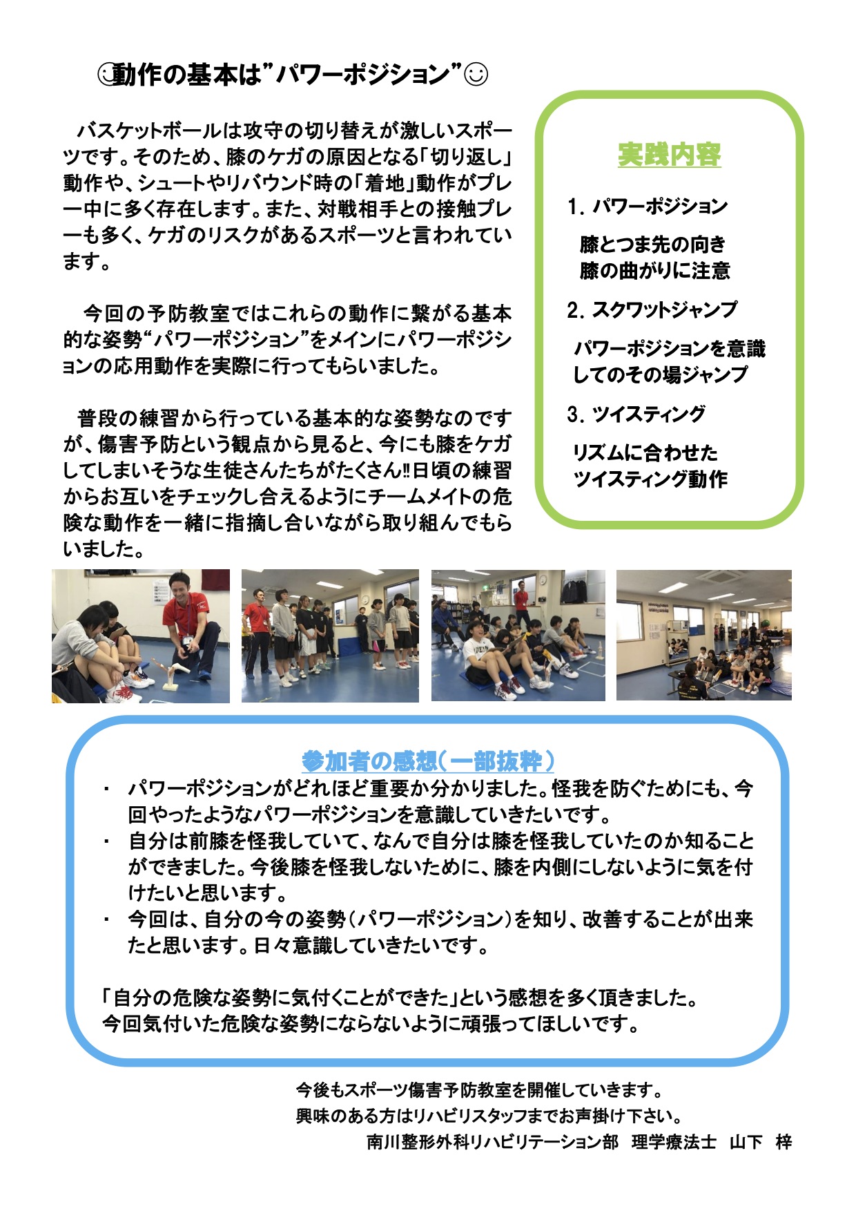 今回は、住吉中学校女子バスケットボール部の皆さんが当院まで足を運んで下さり、膝のケガに対する傷害予防教室を開催させて頂きました。1時間という短い時間ではありましたが、前十字靭帯に関する講義や、パワーポジションのチェックを行い、自分たちがどれだけケガをしやすいのか理解して頂けたのではないかと思っています。