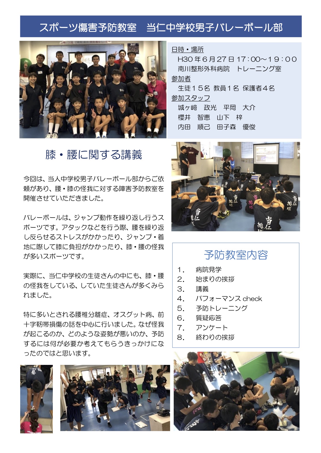 今回は、当人中学校男子バレーボール部からご依頼があり、腰・膝の怪我に対する障害予防教室を開催させていただきました。バレーボールは、ジャンプ動作を繰り返し行うスポーツです。アタックなどを行う際、腰を繰り返し反らせるストレスがかかったり、ジャンプ・着地に際して膝に負担がかかったり、膝・腰の怪我が多いスポーツです。実際に、当仁中学校の生徒さんの中にも、膝・腰の怪我をしている、していた生徒さんが多くみら れました。