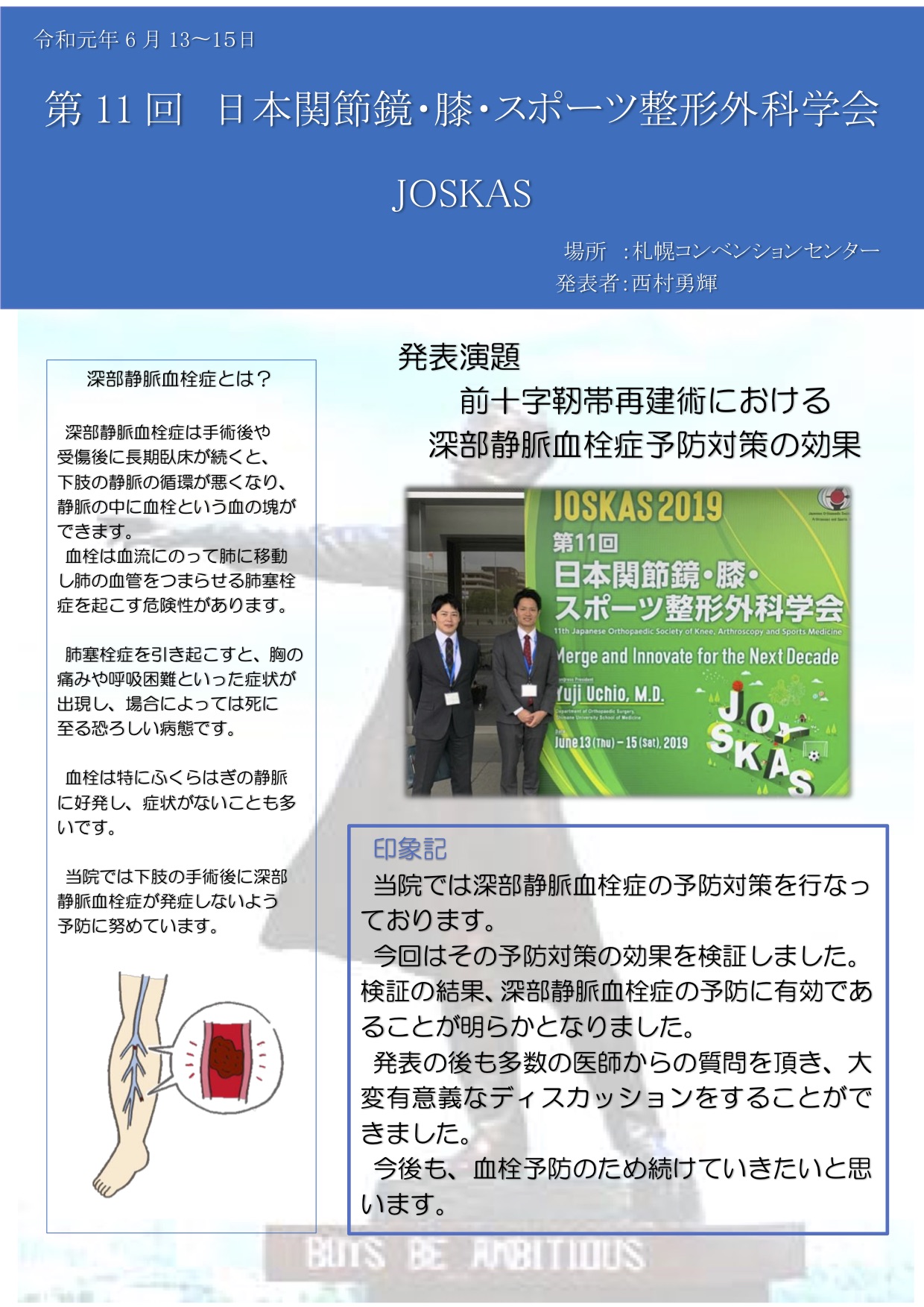 【学会発表】第11回 日本関節鏡・膝・スポーツ整形外科学会 JOSKASで発表してきました。