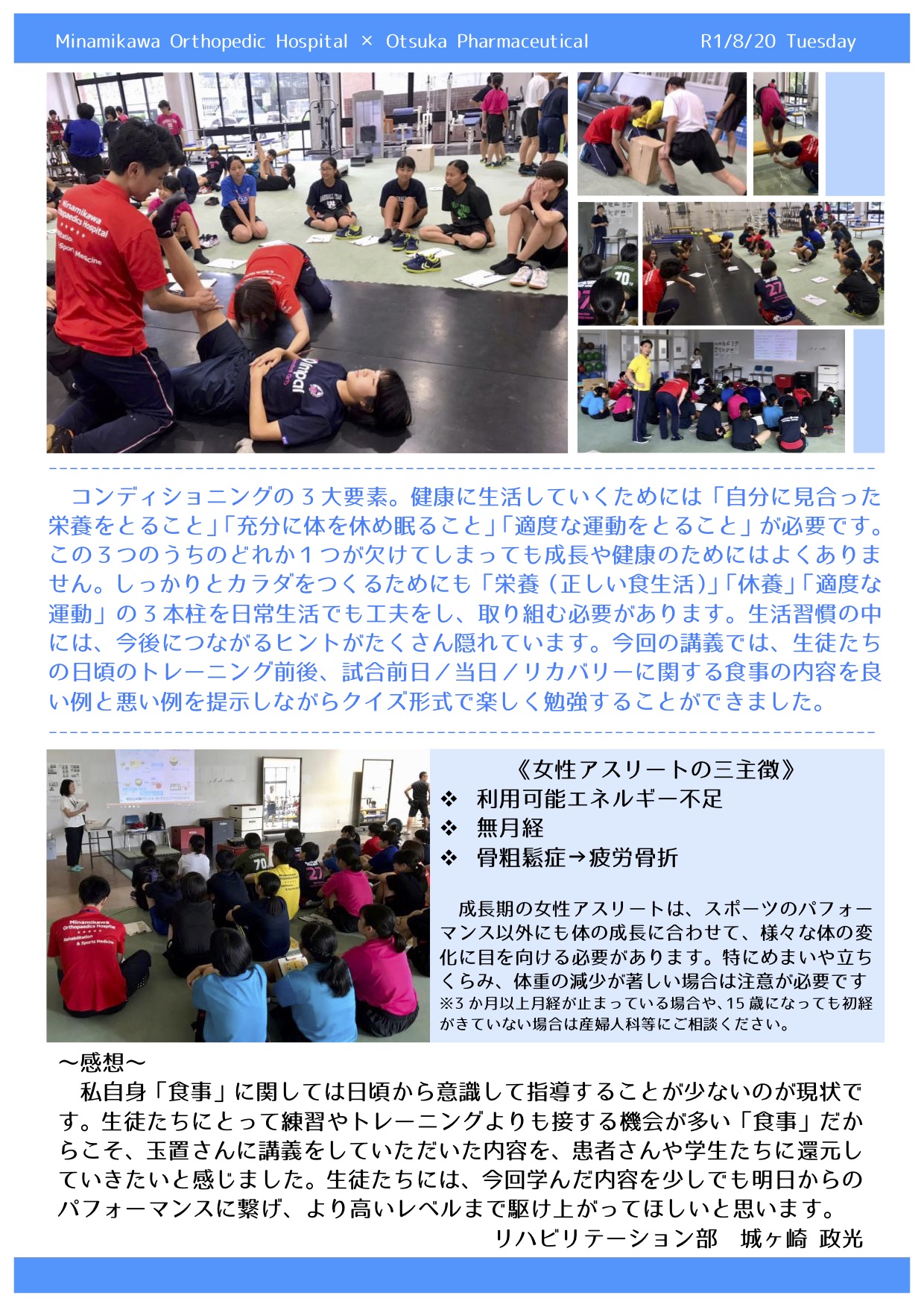 当院としては初の試みとなる特別講師を招いての本格的な栄養指導。今回の食育セミナーでは、コンディショニングに必要な3大要素や食べ物とカラダの関係、カラダづくりとは?など、大切な朝食や補食の摂り方も含め生徒たちに身近な“栄養”についての講義を開催することができました。