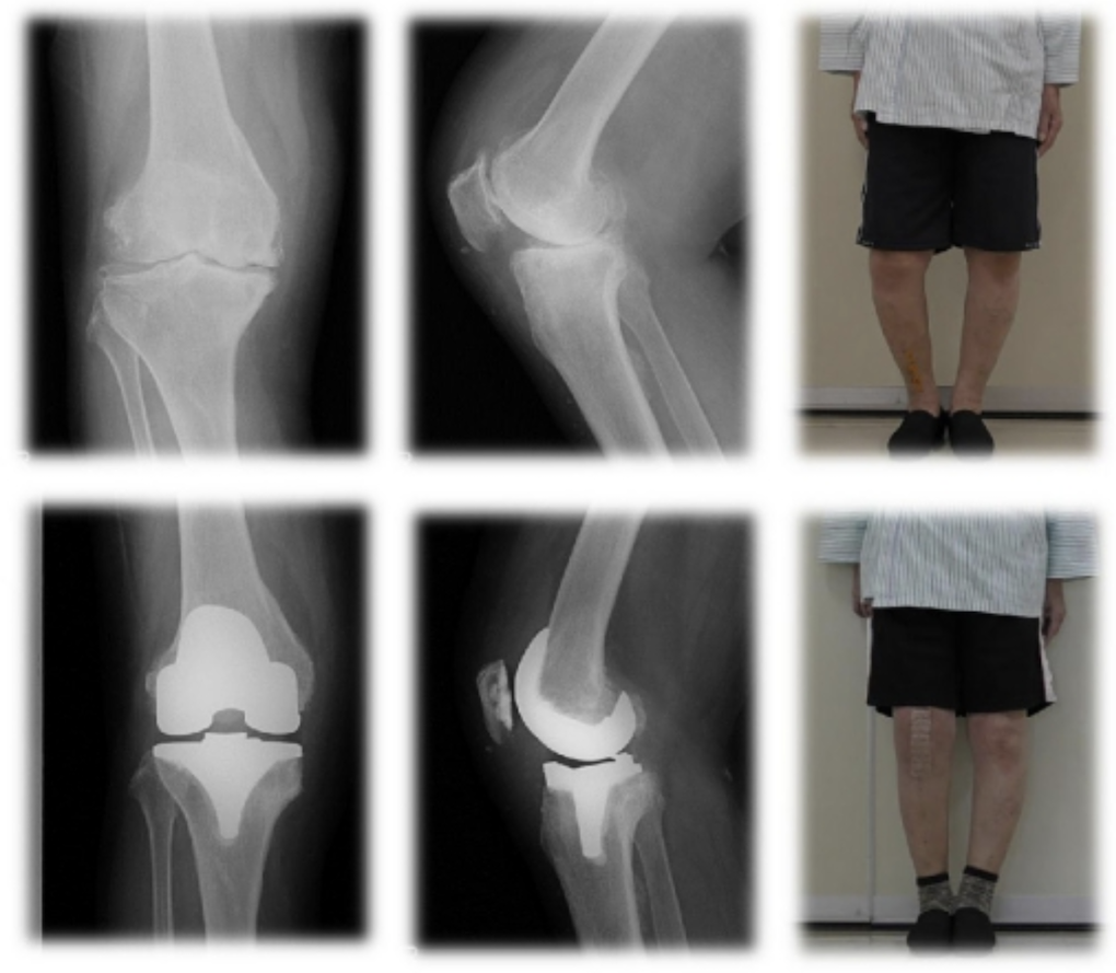 すねの骨を切ってO脚を軽度のX脚に変え、体重がかかる場所を膝の外側に移す手術です。手術後は膝の状態次第でスポーツも可能になります。人工膝関節置換術(Total Knee Arthroplasty)